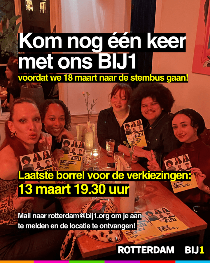 Rotterdam BIJ1 is de afdeling van BIJ1 in regio Rotterdam. De politieke partij, beweging en gemeenschap die strijdt voor een stad waar iedereen kan rondkomen zonder zorgen.